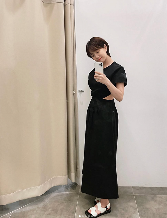 첫번째 사진에서 송지효는 군더더기 없이 미니멀한 실루엣이지만, 허리 옆라인의 컷아웃 디테일이 은근한 포인트가 되는 블랙 컬러의 롱원피스를 입었습니다. 화이트 블랙 배색 샌들로 발끝까지 감각적인 분위기를 완성했고, 짧은 단발 헤어스타일과 미소가 어우러져 시크하면서도 따뜻한 여름스타일을 보여줬습니다.
