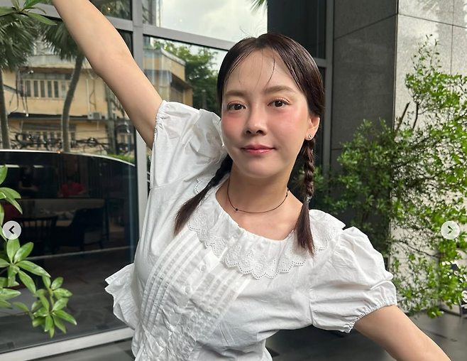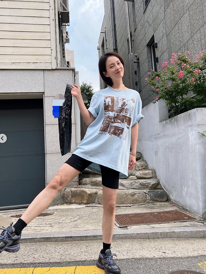 두번째 사진에서 송지효는 연한 블루 계열에 박시한 프린팅 티셔츠에 블랙 바이커 쇼츠와 러닝화 조합으로 활동적이고 힙한 무드를 연출했습니다. 티셔츠를 그대로 툭 떨어뜨린 스타일이 무심한듯 시크하고, 밝은 미소와 포즈가 송지효의 발라한 이미지를 더욱 극대화 시켜주는 스타일입니다.
