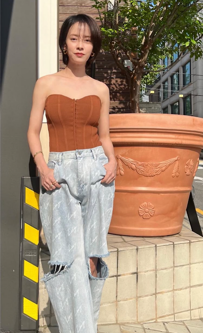 세번째 사진에서 송지효는 빈티지한 분위기의 브라운 튜브 톱과 로고 패턴이 더해진 연청 데님 팬츠를 매치했습니다. 무릎 위로 크게 찢어진 디스트로이드 디테일이 시선을 사로 잡아 도심 속에서도 자유롭고 당당한 에너지가 느껴지는 룩이다. 과감한듯 하면서도 송지효 특유의 꾸밈 없는 느낌이 살아 있어요.