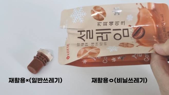 설레임의 스파우트(이지캡) 부분은 비닐과 플라스틱이 붙어있는 복합재질이라 재활용이 되지 않아 일반 쓰레기로 버리고 아래 비닐 부분만 잘라서 비닐 쓰레기로 분리 배출해야 한다고 하는데요,