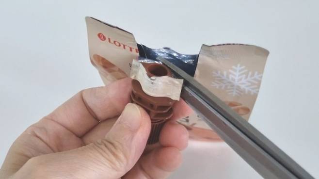 지퍼형의 포장재의 모서리를 잘라낸 이지캡의 너비(약 2cm)만큼 잘라요.