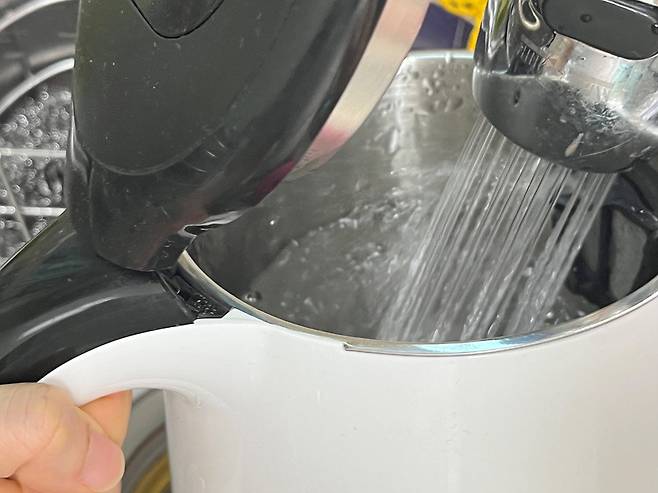 전기 포트에 물을 받아서 끓여 주세요. 물 온도는 50~60도로 맞춰야 하므로 끓는 물을 찬물과 섞어서 따뜻하게 만들어 줍니다.
