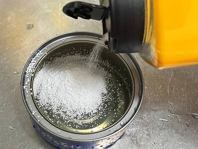 참치캔에는 과탄산소다를 약 2스푼 정도 넣습니다. 과탄산소다를 활용하면 기름때와 찌든 때를 분해하는 데 탁월한 효과가 있습니다.