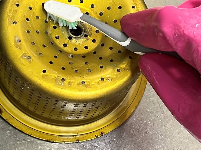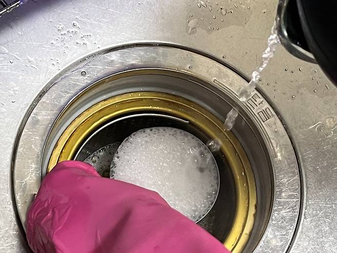 거름망 또한 바닥 부분까지 꼼꼼하게 솔로 닦아 주세요. 여름철에는 쉽게 냄새가 나기 때문에 배수구 청소를 적어도 4~5일에 한 번씩 해주는 것이 좋습니다.