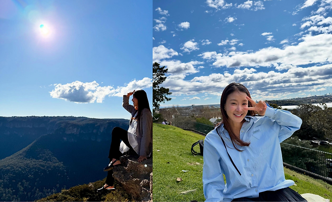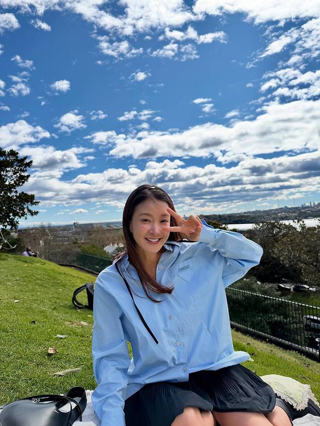 세 번째 사진에서 이시영은 하늘색 오버사이즈 셔츠에 검은색 스커트를 매치한 여성스러운 스타일링을 연출하고 있다. 셔츠의 루즈한 핏이 편안함과 동시에 우아함을 표현하며, 검은색 크로스백으로 실용성을 더했다. 도시의 스카이라인이 보이는 공원에서 손으로 그늘을 만드는 자연스러운 포즈가 전체적인 여유로운 분위기를 완성하고 있다.