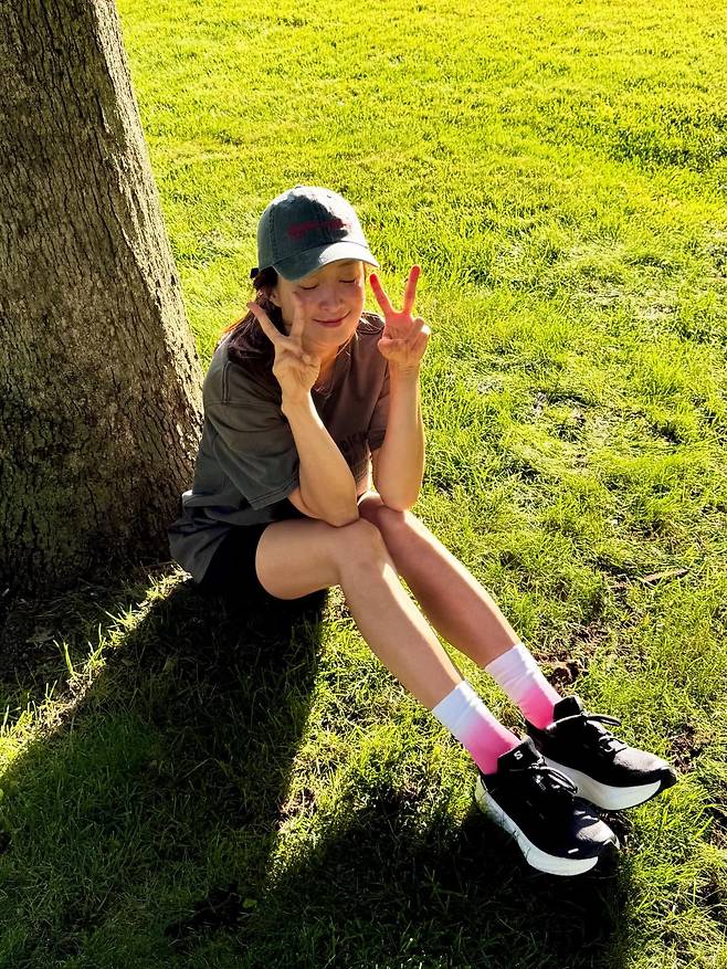 첫 번째 사진에서 이시영은 캐주얼한 운동복 차림으로 편안한 매력을 연출하고 있다. 회색 후드티에 어두운 반바지를 매치하고, 베이스볼 캡으로 스포티한 느낌을 완성했다. 특히 화이트와 핑크 컬러의 양말을 포인트로 활용해 상큼함을 더했으며, 검은색 운동화로 전체적인 통일감을 살려냈다. 나무 아래 잔디밭에서 브이 포즈를 취하며 자연스럽고 친근한 이미지를 표현하고 있다.