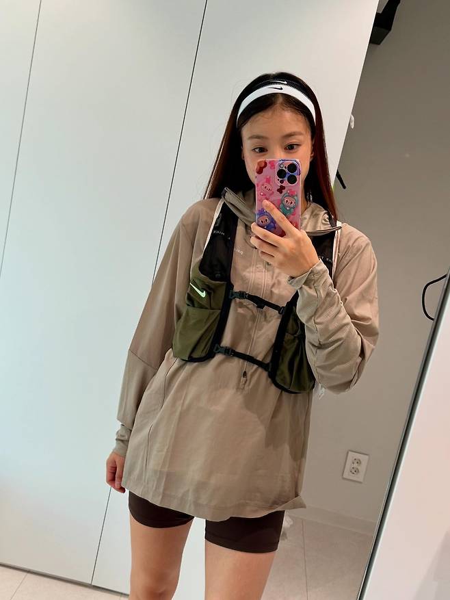 두 번째 사진에서는 베이지 컬러의 후드 집업과 검은색 숏팬츠를 조합한 아웃도어 스타일을 선보이고 있다. 가슴 부분에 착용한 초록색 조끼형 가방이 기능성과 패션성을 동시에 충족시키며, 흰색 헤어밴드로 깔끔한 느낌을 연출했다. 컬러풀한 캐릭터 핸드폰 케이스가 위트 있는 포인트로 작용하며, 전체적으로 활동적이면서도 세련된 스타일을 완성하고 있다.