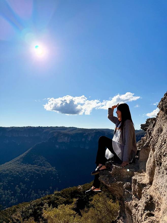 네 번째 사진에서는 산악 트레킹에 적합한 레이어드 룩을 선보이고 있다. 회색 아우터에 흰색 이너를 매치하고 검은색 레깅스로 하의를 구성했으며, 손으로 햇빛을 가리는 포즈로 자연과 어우러지는 모습을 연출하고 있다. 바위산의 웅장한 배경과 함께 모험적이고 활동적인 이미지를 완성하며, 기능성과 스타일을 모두 갖춘 아웃도어 패션의 완성형을 보여주고 있다.