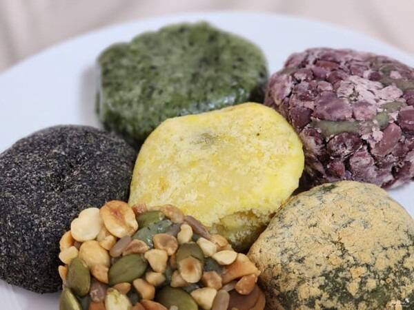 찹쌀가루에 호두, 잣 등의 견과류를 넣고 찐 후, 흑임자와 팥가루를 묻혀 만듭니다.