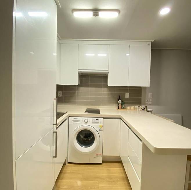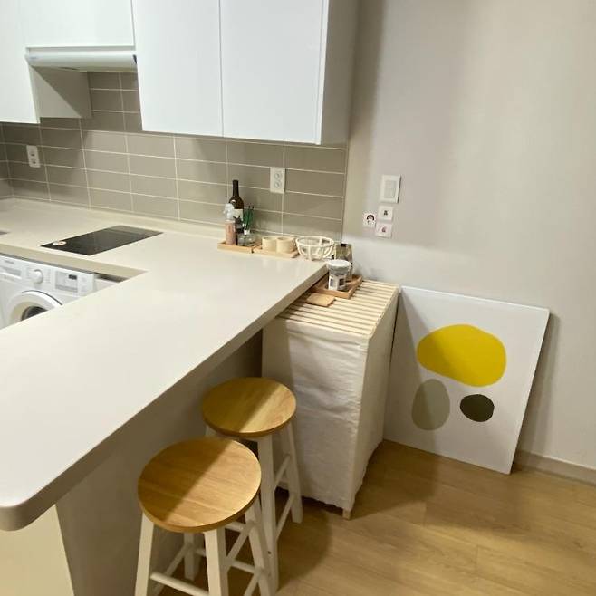 주방도 거실과 마찬가지로 화이트&우드 톤으로 꾸며주었어요. 깔끔하고, 따뜻한 분위기를 뿜어 매우 만족스러워요 :)