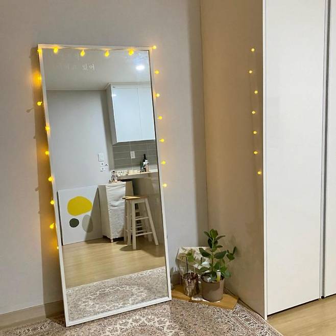 캠핑 갈 때 쓰려고 구입했던, 알전구를 전신거울에 걸어 줬어요. 알전구 인테리어로 집안 분위기가 더 따뜻해진 것 같아요.