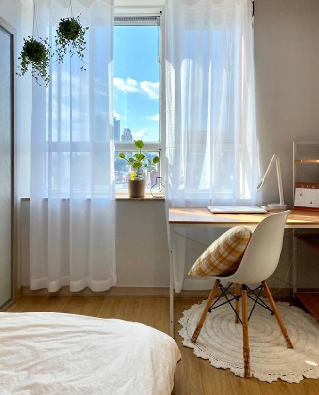 2021년이 되자마자 가구를 재배치했어요. 코로나가 터지며 집에 있는 시간이 많아지다 보니, 커피를 마시며 창밖을 볼 수 있는 구조면 좋겠더라고요. 그래서 창가 쪽으로 책상을 배치했는데, 바람이 살랑살랑 부는 날에는 정말 힐링 그 자체에요.