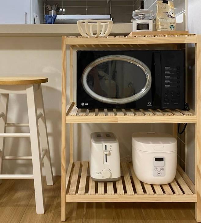 기존의 검은색 전자레인지가 집 분위기와 어울리지 않는 것 같아, 선반을 구매했어요.