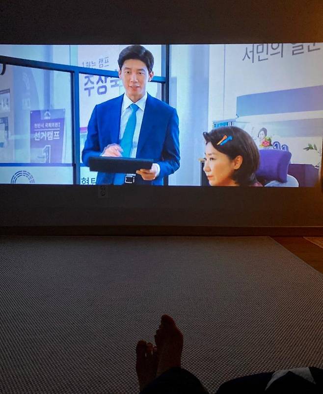영화를 너무 좋아하기 때문에, 하얀 벽면은 빔을 쏠 수 있게 아무것도 두지 않았어요. 오늘도 영화관으로 변신한 우리 집, 좋아하는 취미로 하루를 마무리할 때가 제일 행복한 것 같아요.