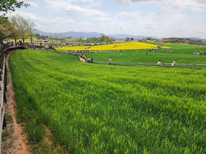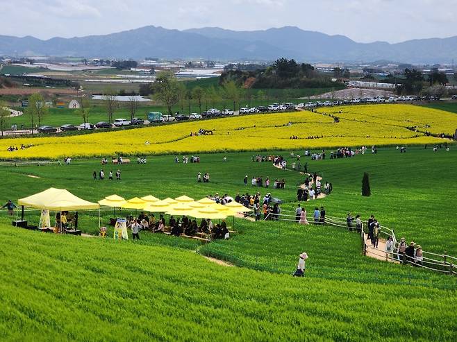 노란색과의 이중주: 올해는 작년보다 규모를 키운 15만 평의 유채꽃밭이 함께 조성되었습니다. 초록과 노랑의 경계선에 서면 보정 없이도 화보 같은 색감을 건질 수 있습니다.