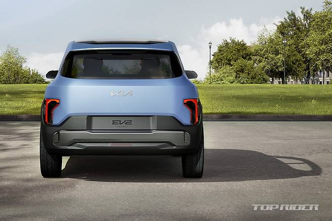 후면부는 기술적인 조형의 코너 디자인으로 개성이 더해졌으며, 면처리는 정교하게 다듬어졌다. EV2 콘셉트카는 콤팩트한 크기임에도 프론트 트렁크, 2열 폴딩 & 리클라이닝 시트 등 공간 활용성이 극대화됐다. EV2 양산형에는 상위 차급 옵션이 탑재된다.