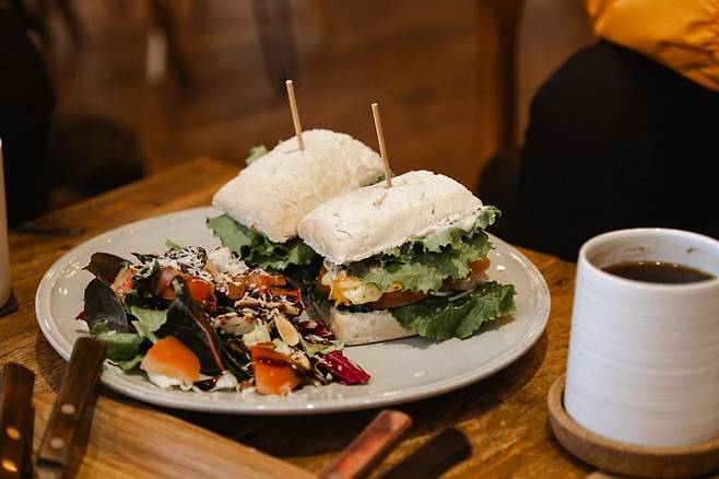 커피 외에도 브런치와 디저트를 함께 즐길 수 있다. 샌드위치, 토스트, 파스타 같은 다양한 메뉴가 준비돼 있으며, 그 양과 맛이 풍부해 가볍게 즐길 수 있는 한끼 식사가 되어준다. 특히 샌드위치는 식감이 부드럽고 속재료가 푸짐해, 음료와 함께 먹기 안성맞춤이다.
