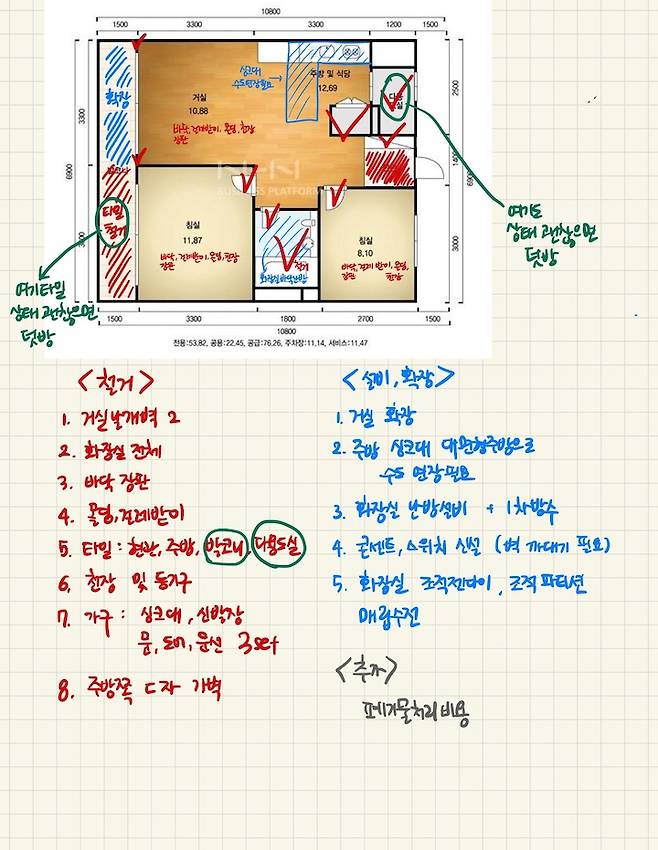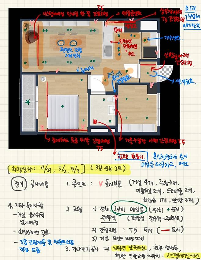 저는 아이패드 굿노트로 공정별 요구사항을 적어서 업체들과 소통을 했습니다. 공정별로 제가 공유했던 내용이에요. 공사 시작 전이라서 공사 중간 혹은 직전에 바뀐 내용들도 약간씩 있지만 큰 틀에서 변화는 없었습니다.