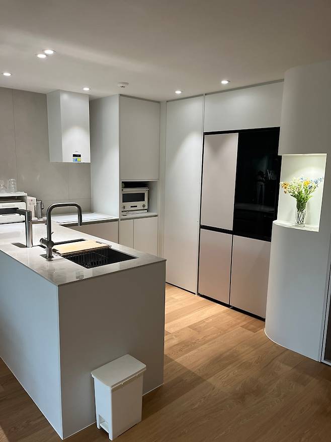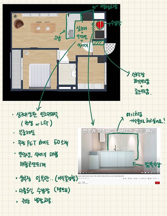 결국 저 레이아웃에서 답답함을 줄이려면 필수 요소의 크기를 줄이는 방법만이 답이었습니다. 양문형 냉장고 -> 상하 투 도어 냉장고, 12인용 식세기 -> 6인용 식세기, 넓은 싱크볼-> 작은 싱크볼, 상부장 필수 등등이요.
