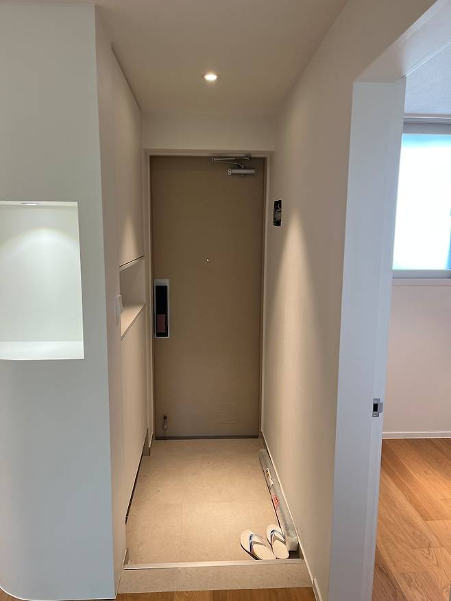 중문을 설치하기 전의 현관입니다. 현관에선 들어오는 사람에게 따뜻하면서도 환하고, 환영받는 느낌을 주고 싶었어요. 그러면서 집 내부가 바로 보이지 않아 설레임을 주기도 하는 공간을 원했구요.