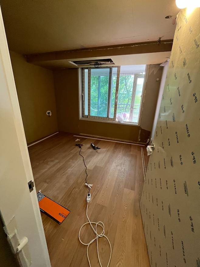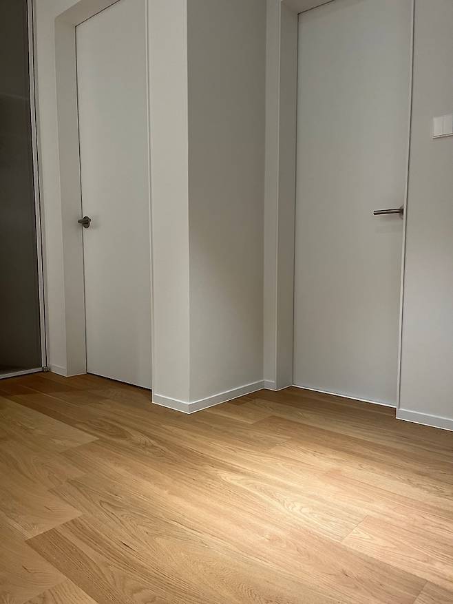 하지만 예산문제로 온전한 원목마루를 하지는 못했고, 온돌마루 (위쪽 일부만 원목자재)로 시공했습니다. 디앤메종 텐우드 오크 컬러로 시공했는데, 딱 원했던 느낌이고 맨발로 다닐 때 촉감도 좋아서 정말정말 만족하고 있어요! 단, 찍힘에는 조금 약한 편입니다. ㅠㅠ