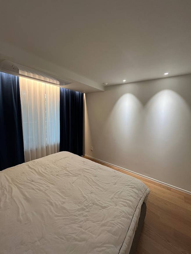 침실은 시스템 에어컨을 설치하고, 침대만 두려고 계획한 공간이었어요. 벽의 수직/수평이 너무 안 맞고, 천장도 상태가 안좋아서 한쪽 벽을 제외하고는 전부 목공이 들어간 곳입니다.