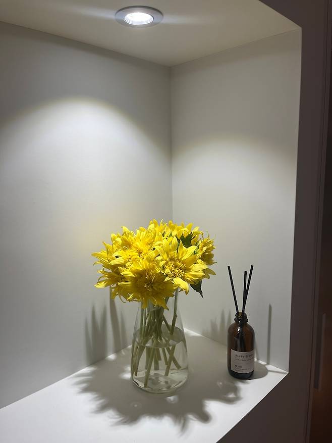 침실인 만큼 아늑한 느낌을 주고 싶어서 조명을 전부 전구색으로 하고 싶었는데 남편이 곧 죽어도 자기 전에 책을 읽겠다고... 집중해야 한다고... 하셔서 주백색과 전구색 조명을 섞어 주었네요. (But, 공사 이래로 자기 전에 책 읽는 것 본 적이 없네요... 뭘 위한 주백색인가.... ㅎㅎㅎㅎ)