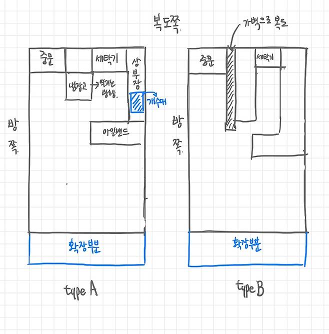 업체 상담을 받으며 제안받았던 20평대 복도식 아파트의 레이아웃은 크게 두 가지 종류로 나뉘더라고요. (방 2개, 화장실 1개 기준) 하지만 두 경우 모두 마음에 차지 않았어요. 무엇보다 좁은 주방에 냉장고, 워시타워라는 덩치 큰 가전이 두 개나 들어가야 하고, 거실 쪽에서 보았을 때 좁은 공간에 어떻게든 가전을 우겨 넣은 느낌이 마음에 들지 않더라고요... ㅠㅠ