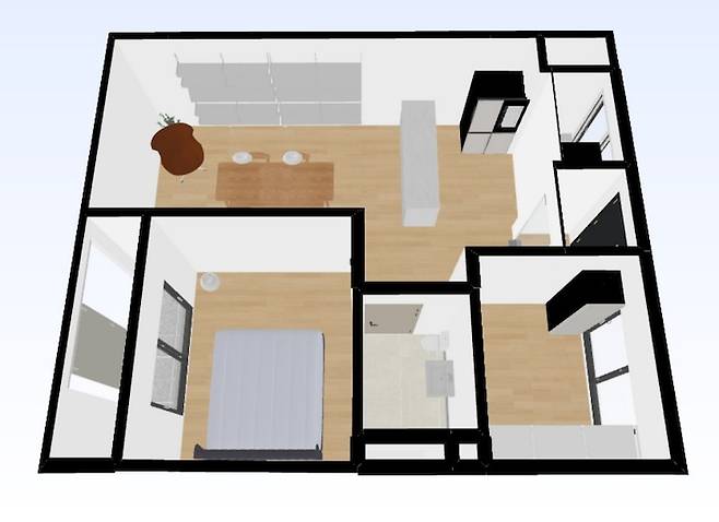 첫 번째 랜더링 이미지입니다. 오늘의집에서 자체 제공하는 3D인테리어 툴을 활용했어요! 아파트 주소를 입력하면 기본 도면이 제공되는 점이 특히 유용했어요. 단, 기성품 말고 가구의 수치나 디테일 등을 아주 정밀하게 표현하기는 한계가 있습니다. 하지만 전체적인 느낌과 이미지를 보는 데에는 아주 간편하고 훌륭했고 실제로 공사기간 내내 이 그림으로 업체들과 소통을 했답니다.