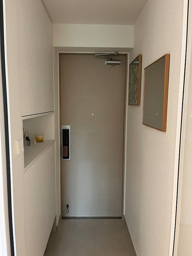 - 현관문 베이지 필름, 베이지 그레이 톤의 타일, 우드 프레임 액자