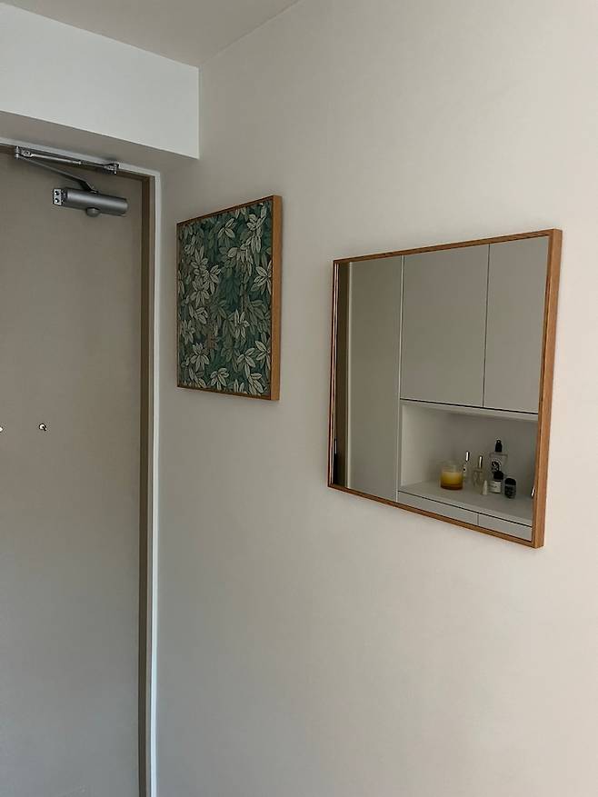 사이즈는 크지 않고, 프레임은 동일한 두 액자입니다. 현관문의 베이지 필름, 타일 컬러와도 조화를 이루도록 나름대로 고심하여 컬러를 맞춰주었답니다 ㅎㅎ 전신이 다 보이지는 않고, 나가기 전에 얼굴 정도를 확인할 수 있는 크기의 액자에요!