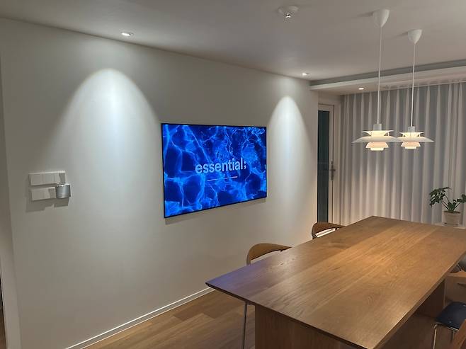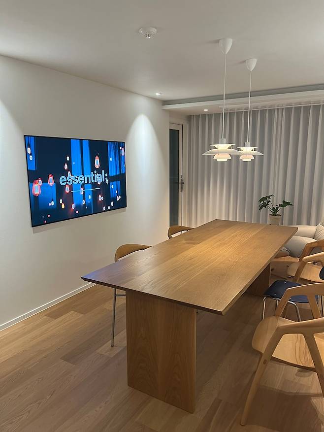 거실 가운데에는 목공으로 가벽을 세운 뒤에 65인치 LG OLED TV를 반매립 해주었어요. 저는 완전 매립보다 TV 테두리가 약간 드러나서 패널의 얇음을 더 잘 보여주는(?) 반매립이 더 예뻐보이더라고요. 저희는 구글 네스트를 스마트홈 허브로 만들었지만, LG TV 자체가 스마트홈 허브의 기능도 할 수 있습니다.