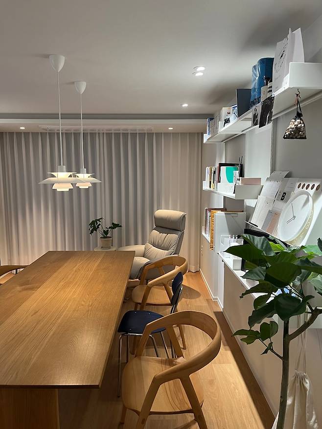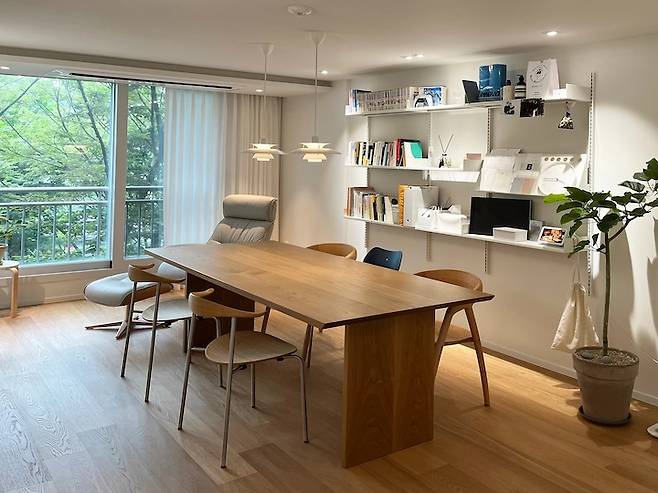 우선, 거실에 길이 2.2m의 대형 테이블을 두어서 다이닝룸, TV 시청, 재택 및 업무 공간의 기능을 할 수 있게 했어요.
