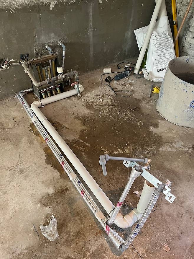 베란다에 워시 타워를 두려면 화장실 쪽에서 급배수 배관을 끌어오는 공사를 해야하는데 저희 집은 안방 벽쪽으로 길이가 짧기 때문에 전혀 어려운 공사가 아니라는 얘기였죠! 이렇게, 레이아웃 문제를 해결하게 됩니다.