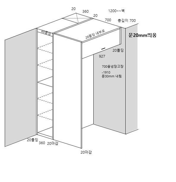 냉장고를 넣으면 뒷쪽에 약간 남는 공간이 생겨서, 수납을 할 수 있게 장을 짜 주었습니다. 깊이가 깊은 선반이라, 대량으로 사온 생필품을 보관하는 용도로 아주 잘 사용하고 있어요!