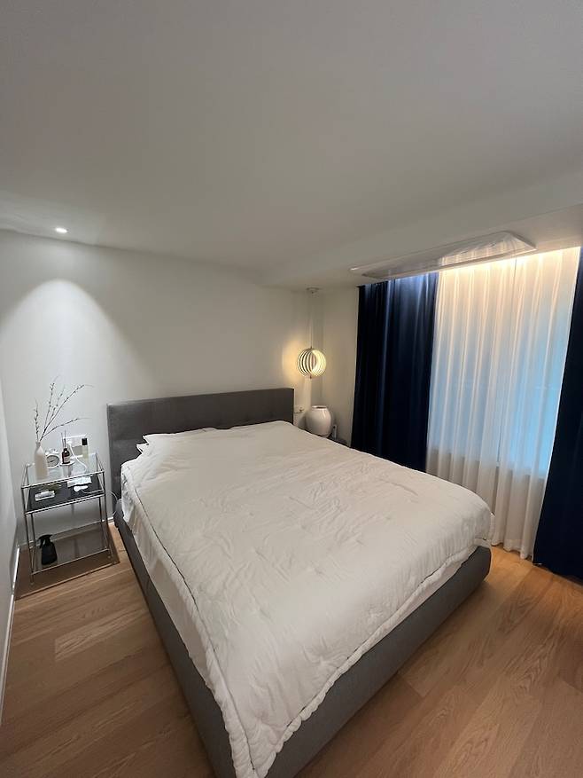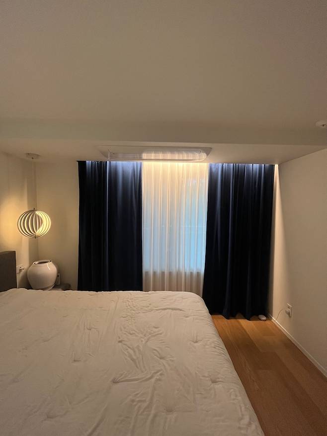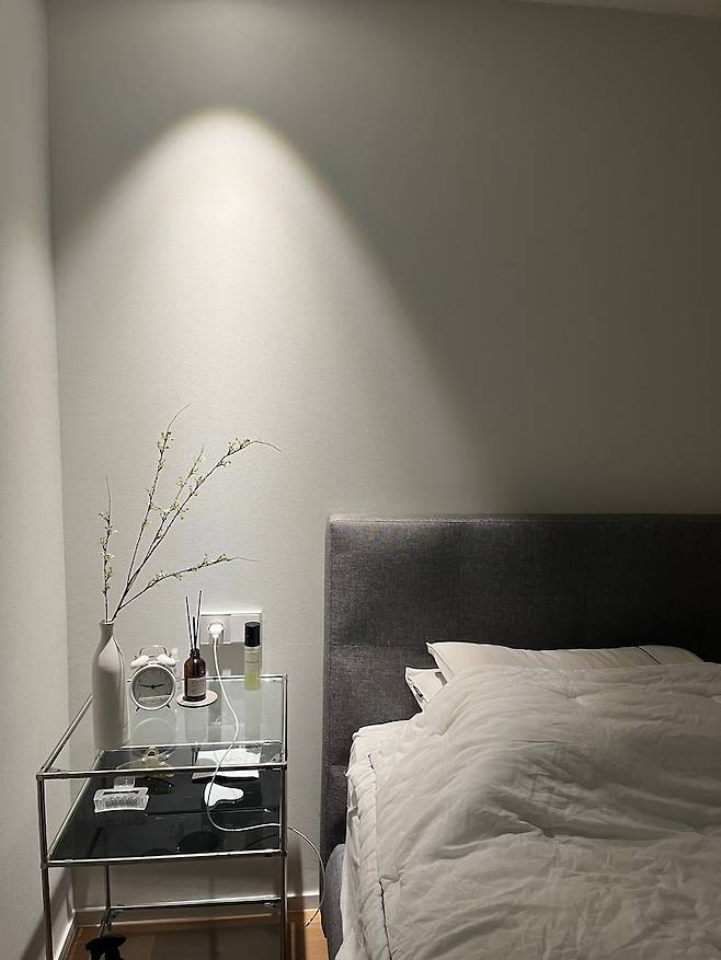 전체조명의 조도가 높은 걸 좋아하지 않아서 조명 갯수를 그렇게 많이 넣지는 않았습니다. 커튼 박스 간접 조명과 다운라이트 3개, 그리고 펜던트 조명 하나. 침대 맞은편 벽에 빔 프로젝터를 쏴서 자기 전까지 유튜브나 넷플릭스를 볼 수 있어요.