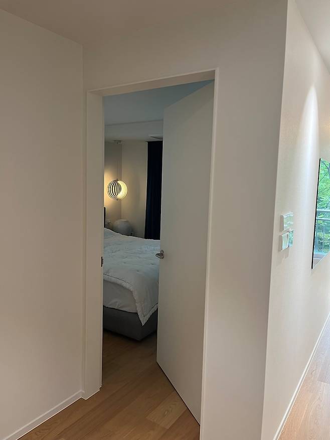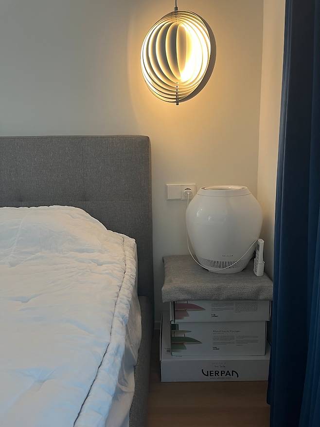저녁에는 침실에 들어가기 전부터 펜던트 등을 켜 둡니다. 저는 문을 살짝 열었을 때 방에 달이 뜬 것 같은 이 모습을 가장 좋아해요. 왔다갔다 하면서 보려고 일부러 저 정도만 문을 열어두곤 합니다.