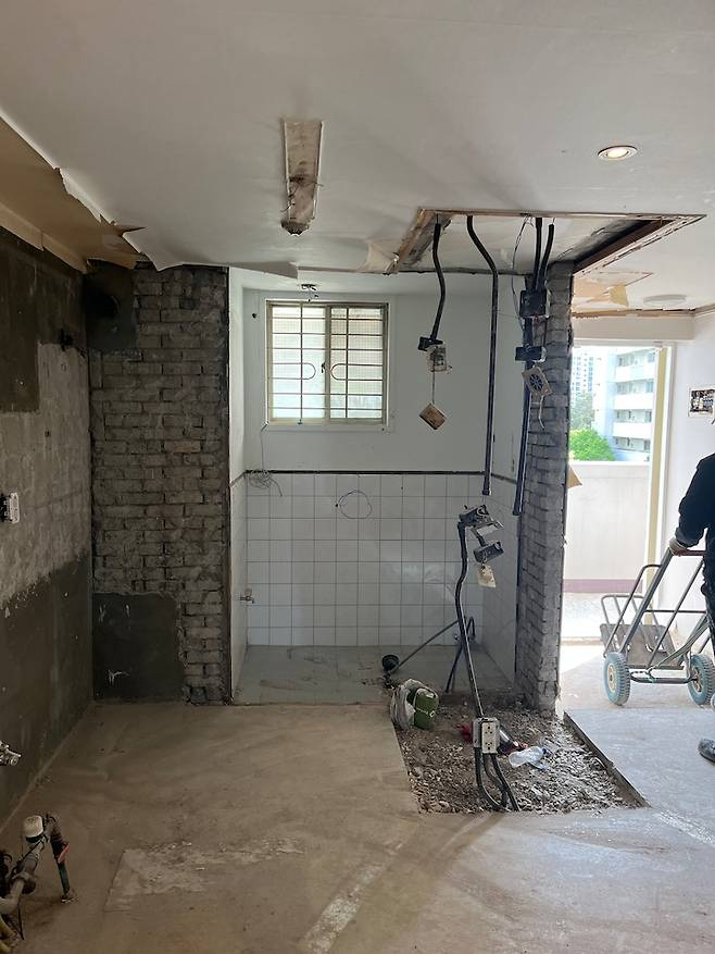 거실과 어울리는 수납이 충분한 대면형 주방을 원했어요. 기존 주방 구조를 시원하게 싹 다 철거해 준 뒤, 다용도실 수도는 사용하지 않을 거라 막았습니다.