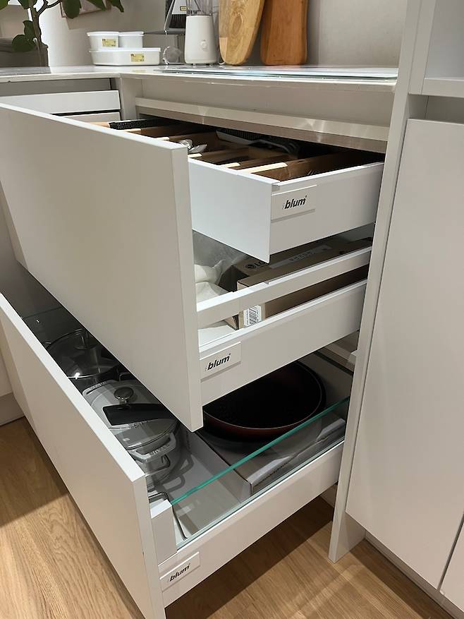 인덕션 아래 서랍은 3단 서랍으로 블럼 레일로 해주었고,