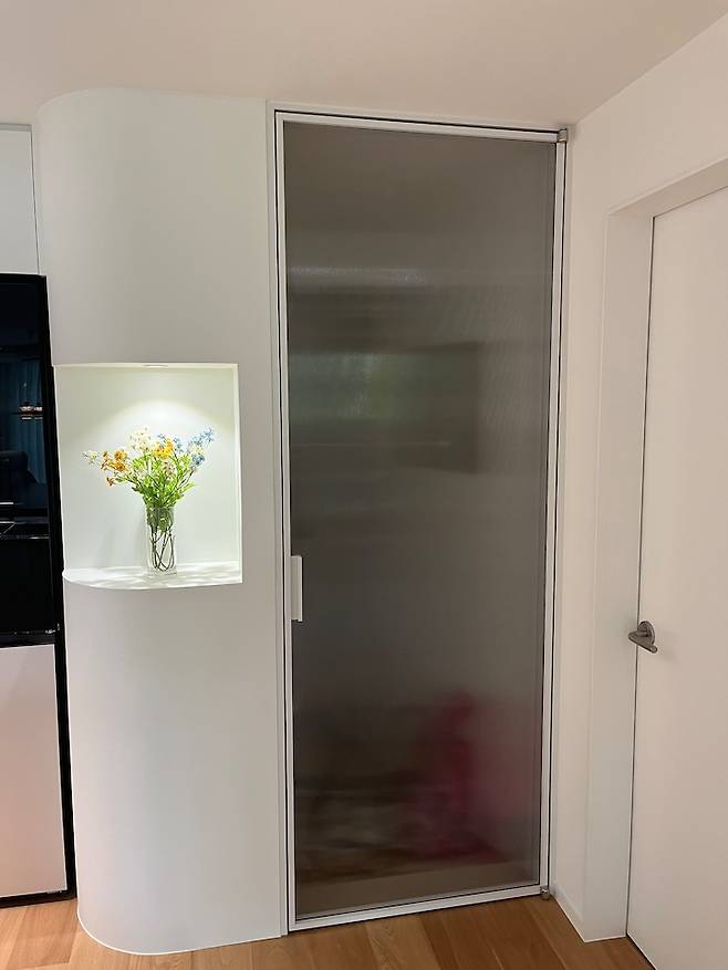 중문이 소음도 차단되고 무엇보다 냉기, 더위 차단에도 너무 너무 효과적이어서 복도식 아파트에서는 필수!!!!! 라고 생각합니다. 공간을 많이 차지 한다는 이유, 좁아 보인다는 이유로 안 하시는 분들도 많은 것 같던데 저처럼 라운드 벽을 함께 시공하면 좁아 보이는 문제는 덜할 거에요.