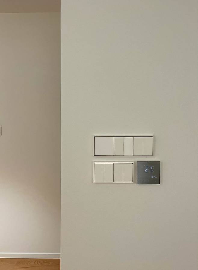 뭐든지 디테일과 마무리에 집착하는 ISTJ라서.. 벽지는 융 스위치의 아이보리와 어울리는 웜톤 화이트색을 열심히 찾았는데 다행히 잘 어울리는 것 같아요. 그리고 네스트 온도 조절기를 설치하고 싶었지만... 공사비의 압박으로 포기하고 대체품을 열심히 찾았는데 다들 디자인이 마음에 안 들더라구요.