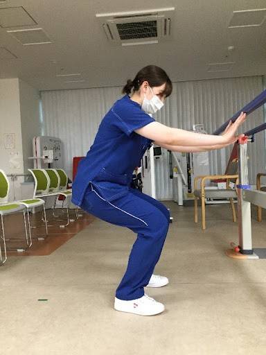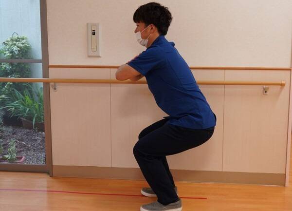 스쿼트 동작 – 무릎을 90도로 굽혀 10회 반복 (1분)