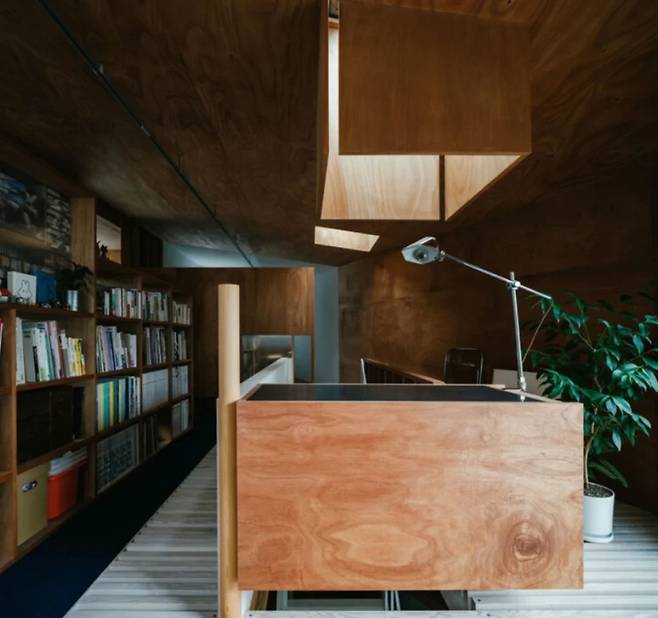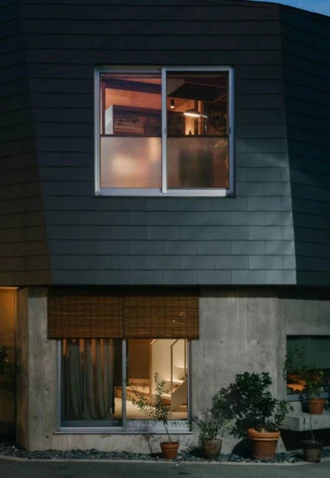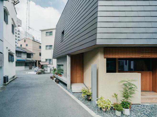 세 방향의 도로로 둘러싸인 불규칙한 대지에서 시작된 이 프로젝트는 1층과 2층을 분리하여 도로에 대한 부담을 줄이는 설계를 채택했다. 지붕과 같은 재질로 마감된 2층은 하늘을 향해 경사진 형태로 개방감을 주며, 처마는 생활 공간과 전면의 작은 제단과 조화를 이룬다.