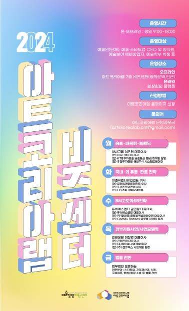 한편 ‘아트코리아랩 비즈센터’는 아트코리아랩 홈페이지를 통해 신청 및 이용할 수 있으며 자세한 내용은 (재)예술경영지원센터 누리집에서 확인할 수 있다.