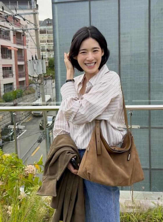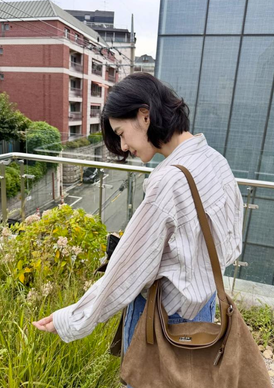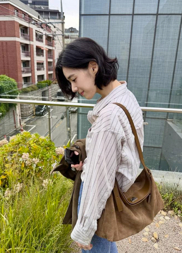 브라운 스웨이드 소재의 빅사이즈 숄더백을 더해 따뜻한 계절감을 강조했습니다. 전체적으로 편안하면서도 세련된 스타일링이 돋보였습니다. 그녀의 데일리룩은 일상에서도 쉽게 따라 할 수 있는 실용적인 패션입니다. 👜🍁
