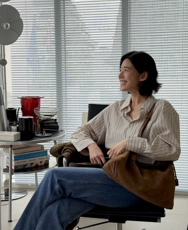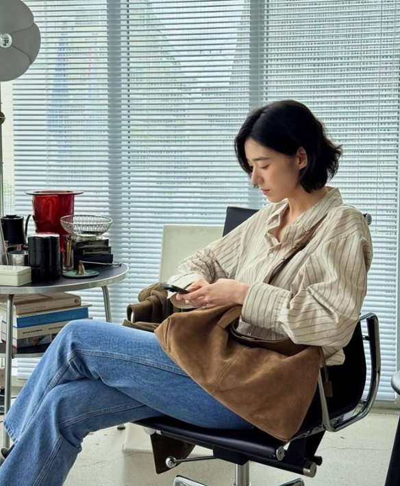 정은채님은 여유로운 핏의 스트라이프 셔츠와 데님 팬츠를 매치하여 무심한 듯 시크한 매력을 발산했습니다. 이 룩은 가을의 감성을 완벽하게 표현하며, 내추럴하게 풀어낸 짧은 헤어와 잘 어울렸습니다. 🧥👖