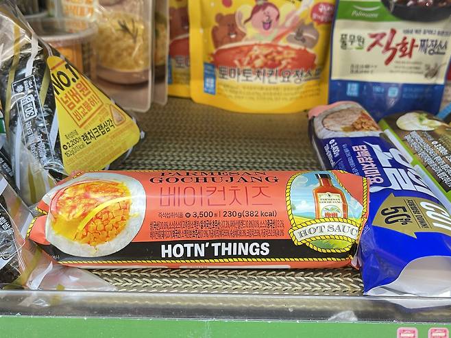 고추장소스의 매콤함과 치즈의 달콤함, 베이컨의 짭짤함을 한 번에 느낄 수 있는 맵달 김밥이에요.