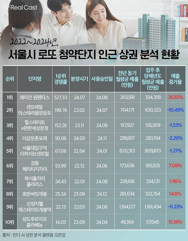 리얼캐스트가 핀테크 기업 핀다(대표이사 이혜민·박홍민)의 AI 상권 분석 플랫폼 ‘오픈업’을 통해 ‘로또 청약’ 경쟁률을 기록했던 서울 아파트들 인근 상권에 대해 살펴봤습니다.