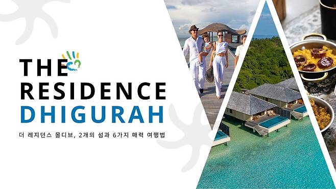 더 레지던스 몰디브는 ‘긴 섬’을 의미하는 디구라(Dhigurah)와 ‘팔루마의 섬’을 뜻하는 팔루마푸시(Falhumaafushi), 두 개의 섬으로 구성되어 있다. 디구라는 몰디브에서도 손꼽히는 길이 약 4킬로미터에 달하는 긴 섬이며, 팔루마푸시는 청정한 자연과 고급 리조트가 조화를 이루는 섬이다. 디구라 섬은 울창한 열대림과 비치 빌라가 조화를 이루고 있으며, 팔루마푸시는 산호초와 맞닿은 오버워터 빌라들이 위치해있다. ‘숲과 바다’라는 서로 다른 두 가지 자연의 매력을 동시에 체험할 수 있는 것이 이곳의 가장 큰 매력일 것이다.