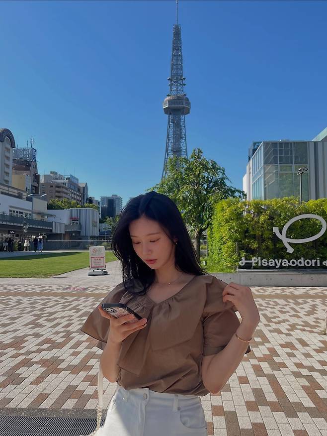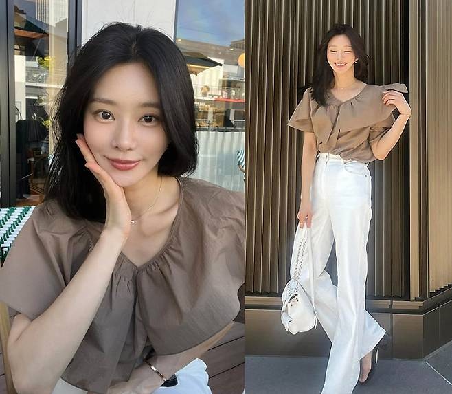 이주빈은 브라운 톤의 볼륨 블라우스에 하이웨이스트 화이트 팬츠를 매치해 군더더기 없는 실루엣을 연출했습니다.
